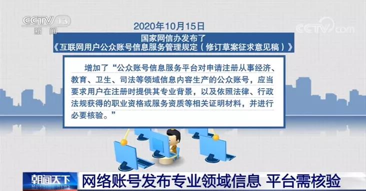 去年10月15日,國家網信辦發(fā)布了《互聯(lián)網用戶公眾賬號信息服務管理規(guī)定(修訂草案征求意見稿)》,其中,增加了“公眾賬號信息服務平臺對申請注冊從事經濟、教育、衛(wèi)生、司法等領域信息內容生產的公眾賬號,應當要求用戶在注冊時提供其專業(yè)背景,以及依照法律、行政法規(guī)獲得的職業(yè)資格或服務資質等相關證明材料,并進行必要核驗。”